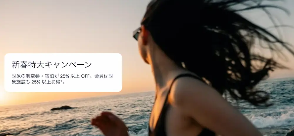 海外を含む、ホテルや航空券+ホテルが25%以上オフの新春特大キャンペーンが開催されています!