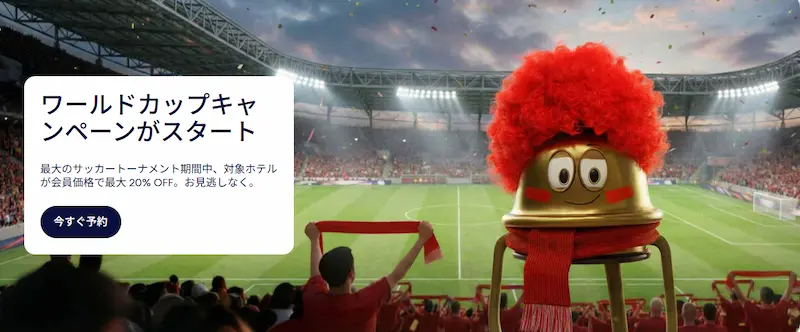 2026年FIFAワールドカップは、カナダ、メキシコ、アメリカの3カ国16都市で共同開催されることに合わせて、それぞれの都市や近郊のホテルが最大20%オフになる「ワールドカップキャンペーン」が開催されています!